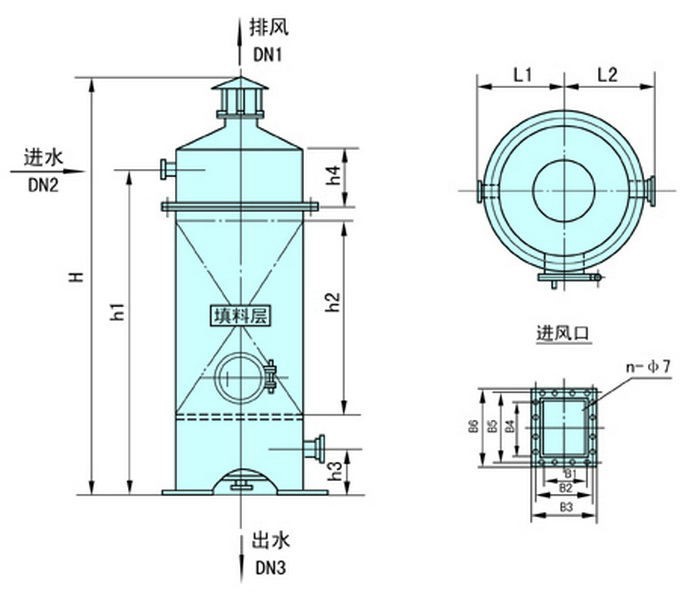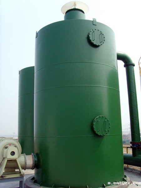 脱气塔由进水装置,填料,风机,水箱组成,进水装置一般采用母支管布水,材质根据不同的需要可以选用304绕丝管和316绕丝管,填料选用多面空心球,根据水质不同可以选用陶瓷和塑料两种,他主要是起到加大水的表面积,使二氧化碳较好的被吹脱、风机主要是提供风源,从而对水的二氧化碳进行吹脱、储水箱使处理后的水储存,可以通过增压泵打到后续的设备中,除碳器工作时,水从上部进入,经配水装置淋下,通过填料层后,从下部排入水箱,而风机的提供的风向是逆向的,即从下向上进行吹脱,通过填料层后,由顶部排出。其原理所以当鼓入除碳器的空气流和除碳水相接触时,水中CO2便会被空气流带出。
