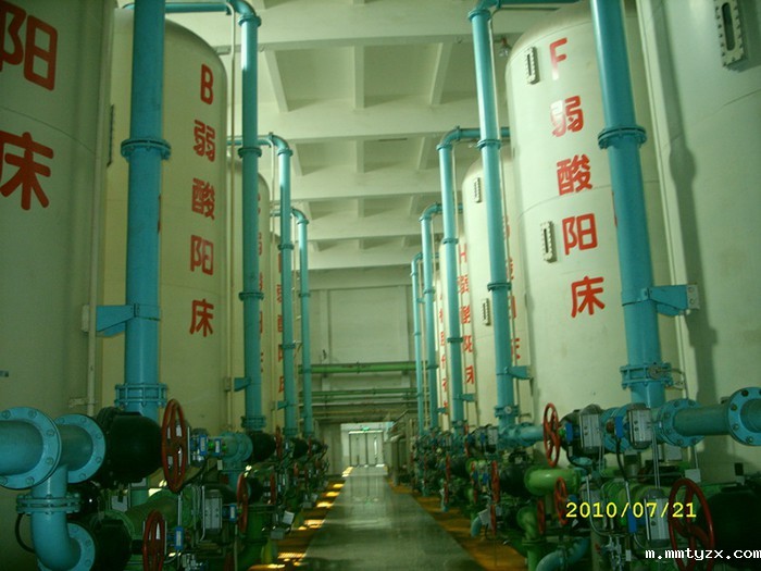钢衬胶混床,正常工作时,阴阳离子树脂按一定比例合在一起进一步去除水中溶解性离子,设计不同组合其出水电导可达到1~18M-cm 。均匀混合的树脂层中,阳树脂与阴树脂紧密地交错排列,每一对阳树脂与阴树脂颗粒似于一组复床,混床就象无数组串联运行的复床。通过混合离子交换后进入水中的氢离子与氢氧离子会立即生成电离度很低的水分子(H2O),很少可能形成阳离子或阴离子交换时的反离子,因而能制取纯度相当高的成品水。